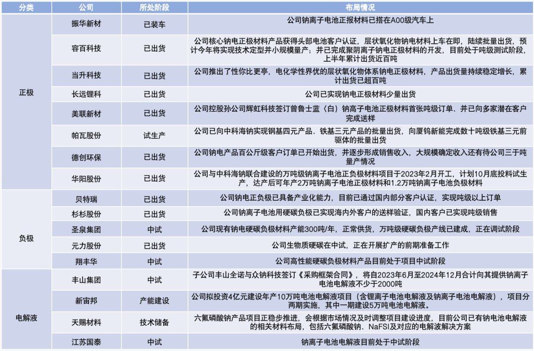 在钠电池材料体系方面,正极材料方面主要布局厂商有容百科技、振华新材、当升科技等。其中匹配振华新材钠离子电池正极的电芯已经实现了装车应用。