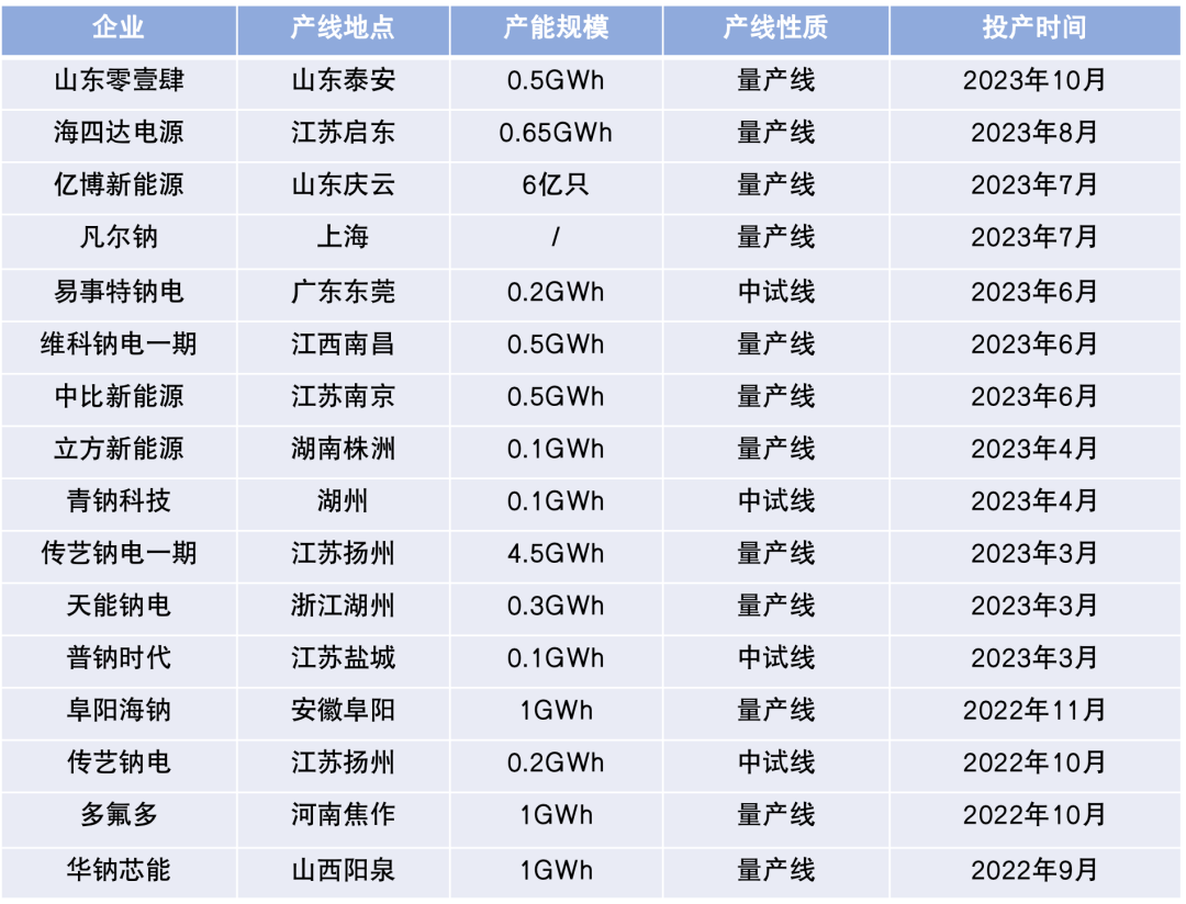 2023年以来已有超22家企业发布了钠离子电池新品、超31家钠电企业获得融资、超80个钠电项目签约/开工。据起点钠电不完全统计,目前宣布投产的企业主要包括阜阳海钠、 华钠芯能、传艺钠电 、多氟多、维科钠电、中比新能源等,合计产能超10GWh,此外还有多家企业中试线投产。
