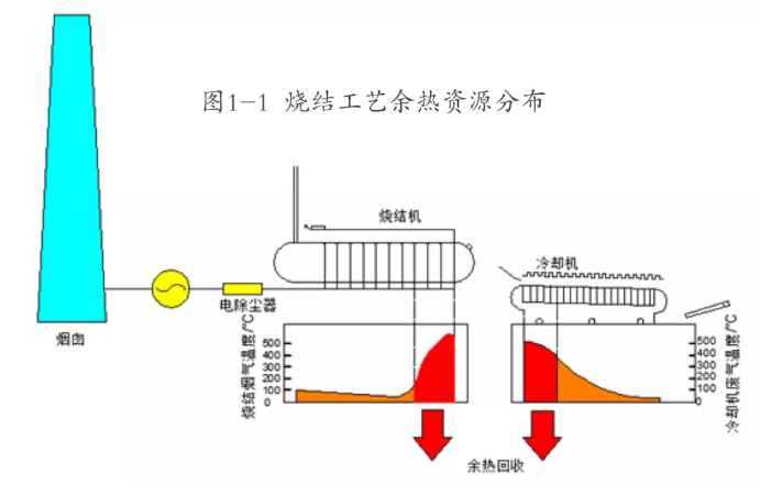 现状:原有烧结机环冷机(带冷机)均已建设环冷余热锅炉回收余热进行利用。环冷余热锅炉采用双压、双通道、自除氧锅炉,配套一台纯凝补汽式汽轮发电机组,汽轮机装机容量为25MW。但在实际运行中,汽轮机发电负荷在10~ 13MW,出力严重不足。烧结机生产过程中会产生大量的中低温废气,原工艺设计对此部分余热资源没有回收利用。烧结工艺余热资源分布如图1- 1所示
