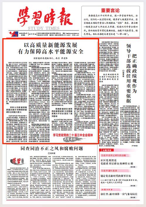 能源安全事关经济社会发展全局。党的十八大以来,习近平总书记围绕国家能源安全发表了一系列重要论述,引领我国能源发展进入新时代、开创新局面,特别是从国家发展和安全的战略高度,创造性地提出“四个革命、一个合作”能源安全新战略,系统阐述了新时代保障能源安全、推动能源高质量发展的重大理论和实践问题,为新时代保障国家能源安全工作指明了前进方向、提供了根本遵循。党的二十届三中全会强调要加快规划建设新型能源体系,完善新能源消纳和调控政策措施。国家能源局党组坚持以习近平新时代中国特色社会主义思想为指导,深入学习贯彻党的二十届三中全会精神,引导能源系统广大党员干部学习好、运用好、宣传好习近平总书记关于国家能源安全的重要论述,不断加强党对能源工作的全面领导,深入践行能源安全新战略,以更大力度推动新能源高质量发展,为中国式现代化贡献能源力量,为共建清洁美丽的世界作出更大贡献。