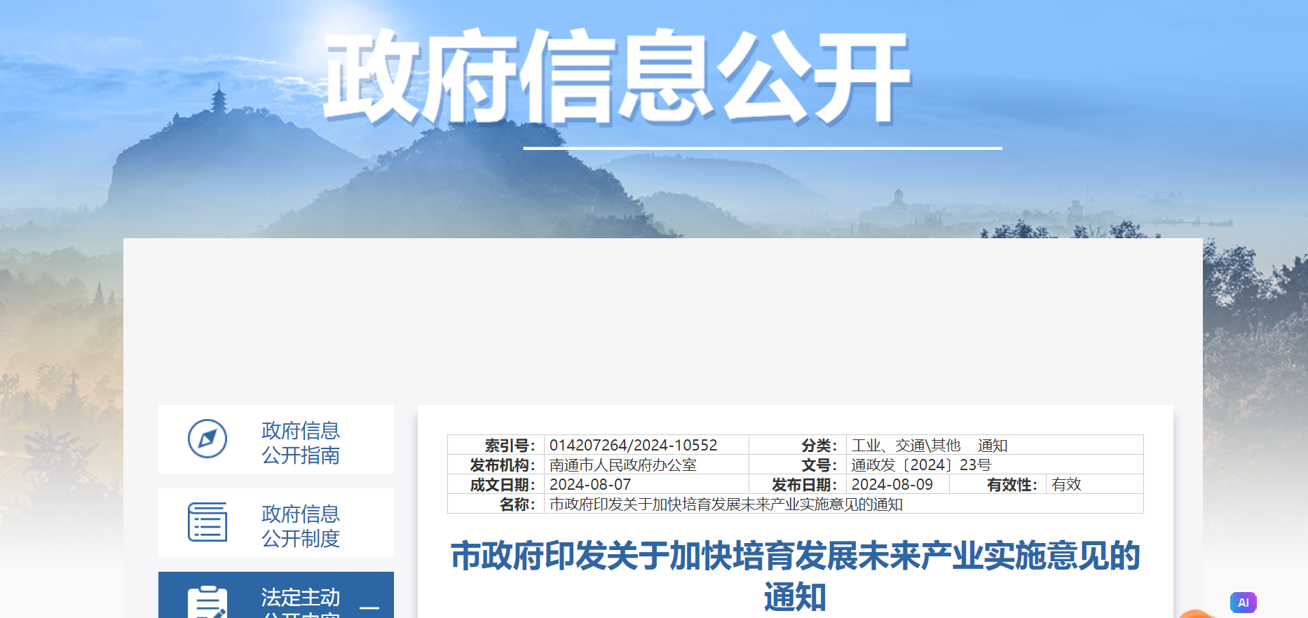 日前,江苏省南通市政府印发《关于加快培育发展未来产业的实施意见》(以下简称《实施意见》),提出布局六大未来产业,聚焦7个科创细分赛道,全力打造长三角未来产业创新高地。