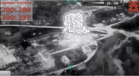 从乌克兰军事记者Andriy Tsaplienko 公布的视频来看,被轰炸的地方瞬间燃起了熊熊烈火,还升起了一朵巨大的蘑菇云。