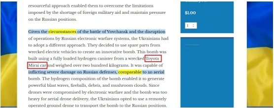 丰田氢能车代替军火 乌克兰炸毁俄军观察哨