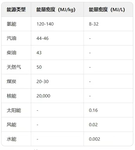 其他能源如汽油为44-46MJ/kg、柴油为43MJ/kg,能量密度只有氢能的三分之一左右。