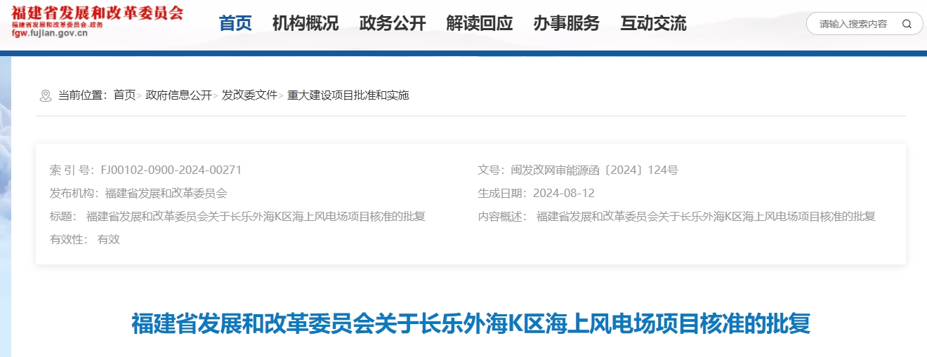 报来《华电(福州)海上风电有限公司关于申请核准长乐外海K区海上风电场项目的请示》(福州海电综〔2024〕1号)及有关材料收悉。经研究,现就该项目核准事项批复如下: