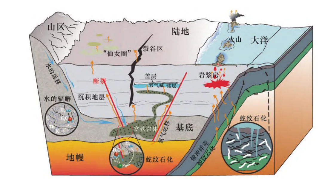 地壳辐射裂解水、水岩反应和深层脱气等非生物成因被认为是天然氢的主要形成机理。天然氢成因类型众多,经归纳总结,主要可分为两大类划分方式,一是划分为原生成因氢源和次生成因氢源;另一种划分为非生物成因氢源和生物成因氢源,其中非生物成因氢源得到学术界广泛认同,包括水岩反应、地幔脱气、水的辐解。水岩反应包括蛇纹石化作用、水与岩石表面反应和矿物中羟基反应,其中蛇纹石化作用研究最多,即水与富含铁的岩石发生反应产生氢气。深层脱气理论认为,氢气来自地球更深处的地幔或地核,氢气沿着板块边界和断层缝隙上升到地表形成。当前高质量天然氢(体积分数大于10%)主要发育于蛇绿岩带、裂谷和前寒武系富铁地层。据已有研究,探测深度增加,氢气浓度也逐渐升高。当探测深度达1093米,氢气浓度为15%;探测深度达1250米时,氢气浓度增加到20%;探测深度达3000米时,氢气浓度可能增加到98%。水的放射性分解也被认为是氢的重要来源,即地壳深层大量铀、钍等放射性元素衰变时释放射线,其能量将水分子分解产生氢气。通过辐射分解产生氢气只需要水和放射源,因此水的辐解过程被认为可以在地球上广泛发生。