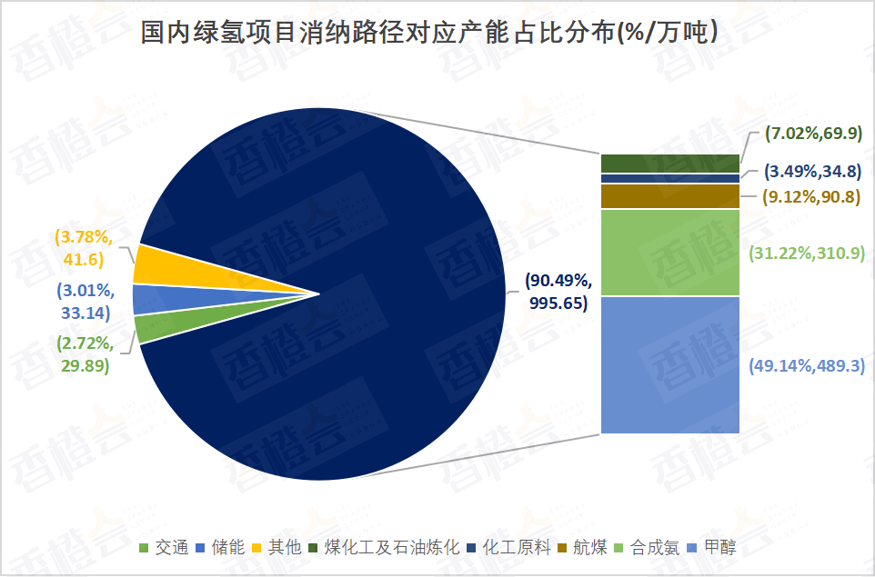 其中绿氢化工应用占比约为90.49%,规划消纳绿氢产能约995.65万吨;绿氢交通应用(主要指陆上交通)占比约为2.72%,规划消纳绿氢产能约29.89万吨;规划储能领域(主要指氢发电、电网调峰等)应用占比约3.01%,规划消纳绿氢产能33.14万吨;绿氢其他应用(含冶金、电子特气等)占比约为3.78%,规划消纳绿氢产能约41.6万吨。