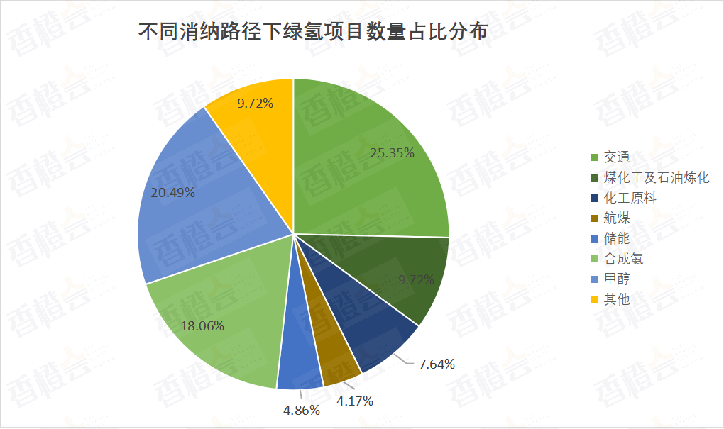 基于此,盘点了已公布绿氢应用方向的制氢项目(具体项目详情见香橙会氢能数据库)。分领域来看,化工、交通、储能是现阶段绿氢消纳规划的主要路径。