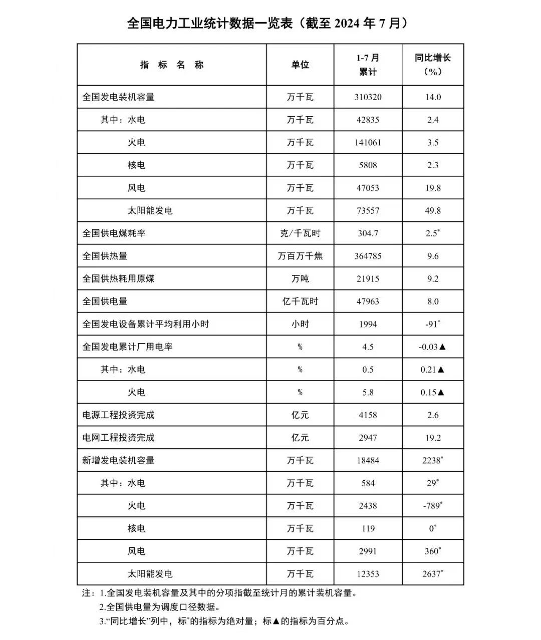 截至7月底,全国累计发电装机容量约31.0亿千瓦,同比增长14.0%。其中,太阳能发电装机容量约7.4亿千瓦,同比增长49.8%;风电装机容量约4.7亿千瓦,同比增长19.8%。
