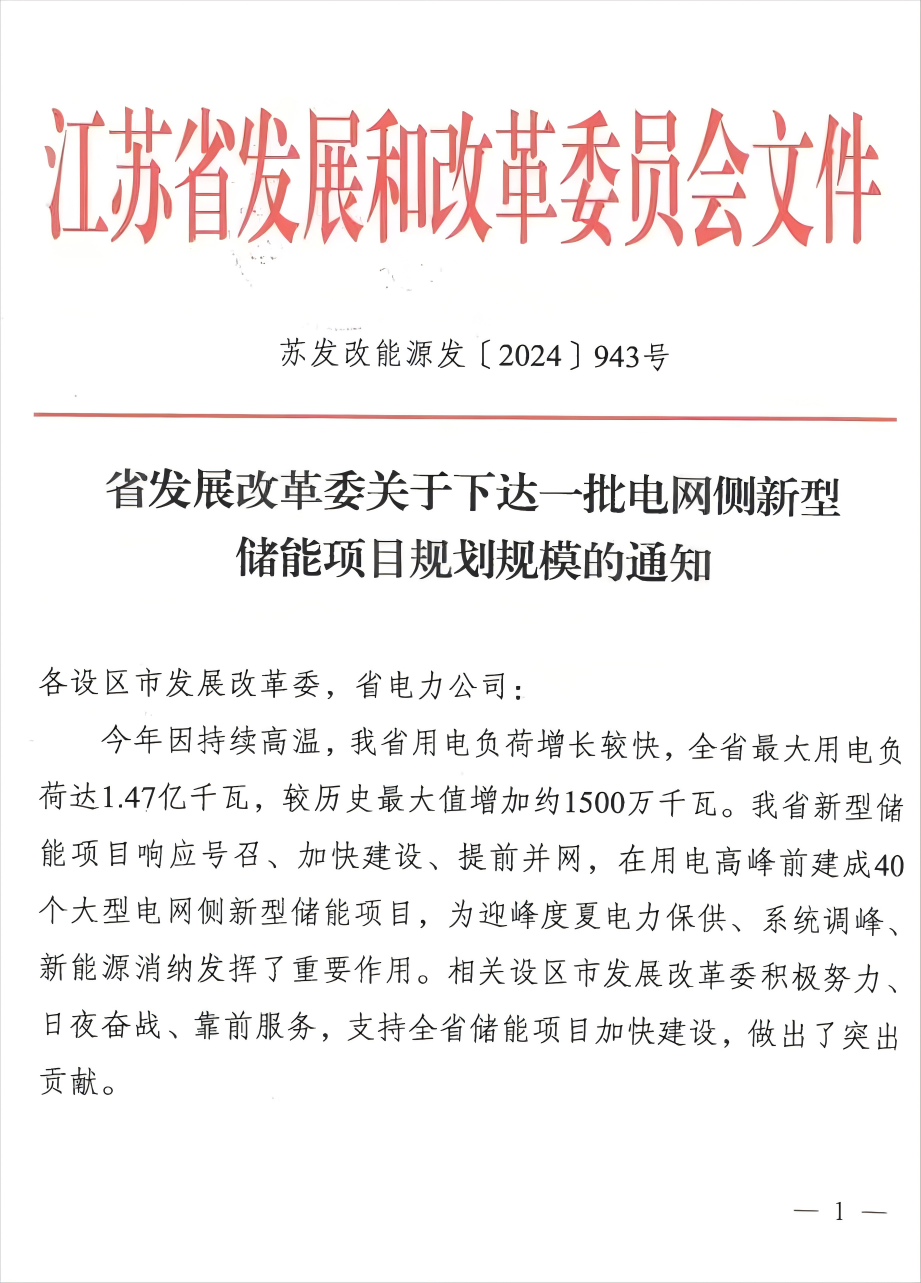 1GW!江苏省下达一批电网侧储能项目规划规模的通知!