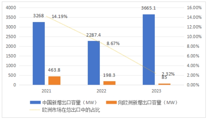 2021年,中国向欧洲(主要是塞尔维亚)出口了463.8MW风机,而到了去年,这个数字下降到了85MW,欧洲市场在总出口中的占比下降到了2.32%。