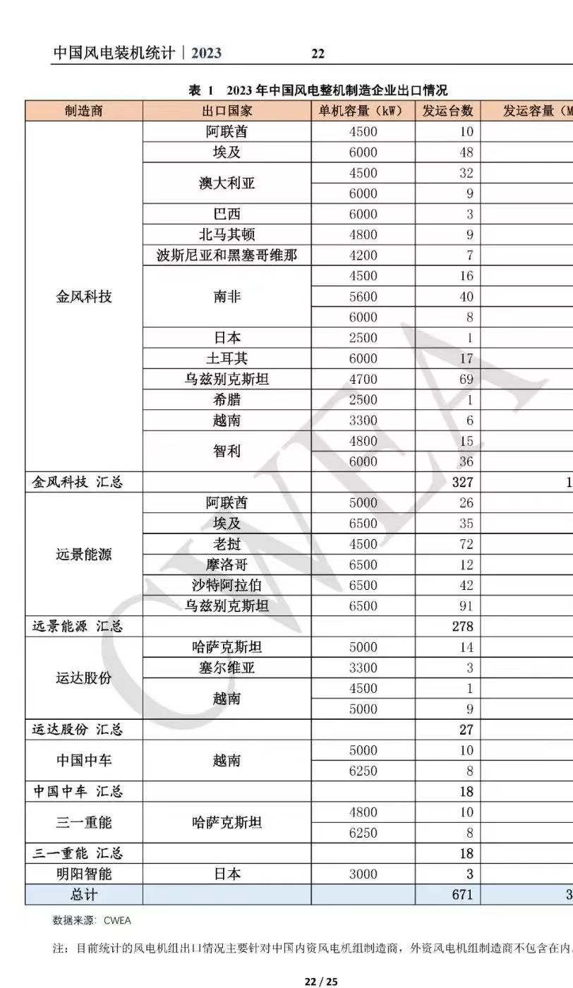 其实通过去年的出口数据也可以看出,中国风电企业在国际市场上的表现越来越亮眼亮眼,2023年,中国风电机组新增出口671台,容量3665.1MW,同比增长60.2%。