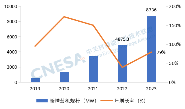 2023年,美国新增装机规模达到8.7GW,同比增长超过90%。其中,表前储能新增装机7.9GW,功率装机占比同比提升近4个百分点,达到91%;表后储能仍延续以户储为主的格局,近几年户储在表后储能中的占比一直保持在80%以上。