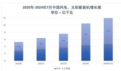 图说:2020年-2024年7月中国风电、太阳能装机增长图