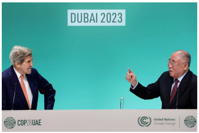 图说:美国首席气候谈判代表克里与中国气候变化事务特使解振华在COP28期间沟通