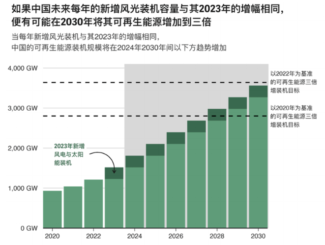 国际可再生能源署倡议将三倍增计划的基准年设为2022年。若按此计算,中国从现在起每年新增的可再生能源装机容量只要略高于2023年官方宣布的年度增长速度,这个目标也可以实现。