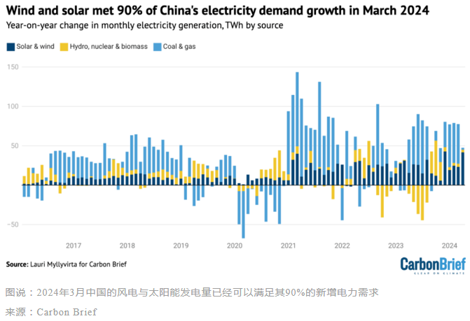 图说:2024年3月中国的风电与太阳能发电量已经可以满足其90%的新增电力需求