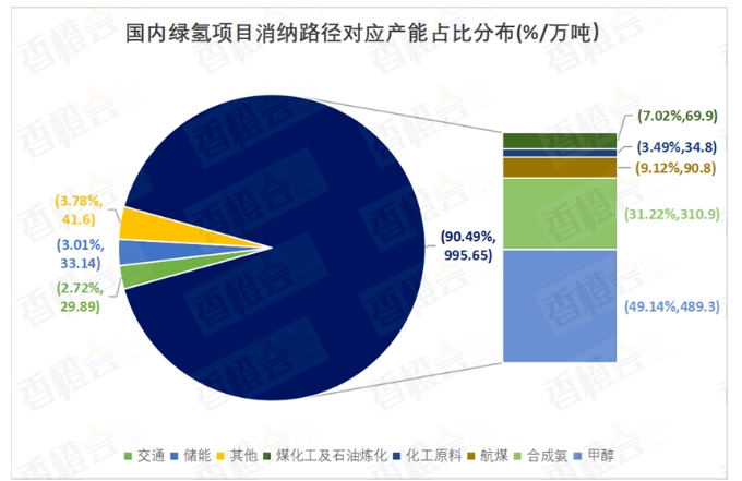 图说:国内绿氢项目消纳路径对应产能占比分布(%/万吨)