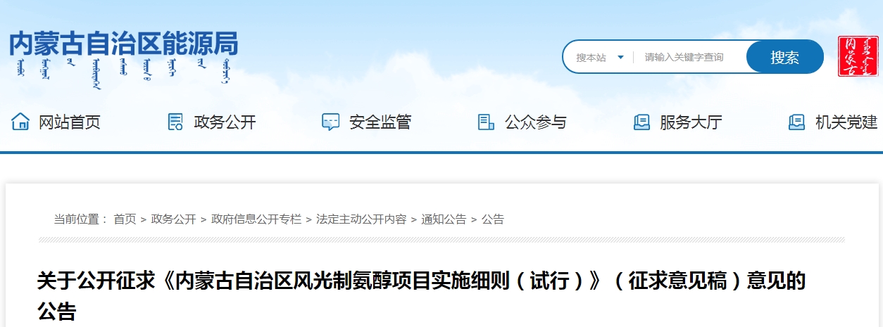 日前,内蒙古能源局官网发布关于公开征求《内蒙古自治区风光制氨醇项目实施细则(试行)》(征求意见稿)意见的公告。
