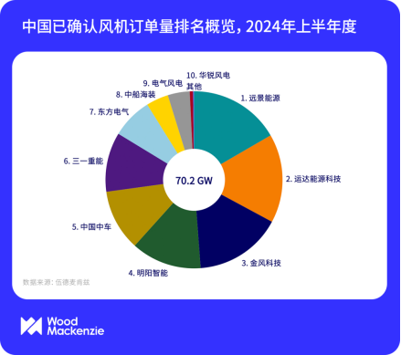 在手订单方面,伍德麦肯兹近期的研究报告显示,今年上半年,中国市场风机订单量超过70GW,在五大上市整机商中,运达股份排名第一,金风科技排名第二位,其后依次是明阳智能、三一重能、电气风电。