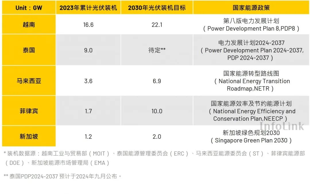在全球净零碳排趋势下,东南亚地区因其日照充沛,经济快速增长,伴随产业转型带来的绿电需求上升,光伏已成为当地发展再生能源的主力,而越南、泰国、马来西亚、菲律宾与新加坡等五个主要光伏需求国,凭借近期推出的一系列政策利好,将有望带动东南亚成为重点光伏市场之一。