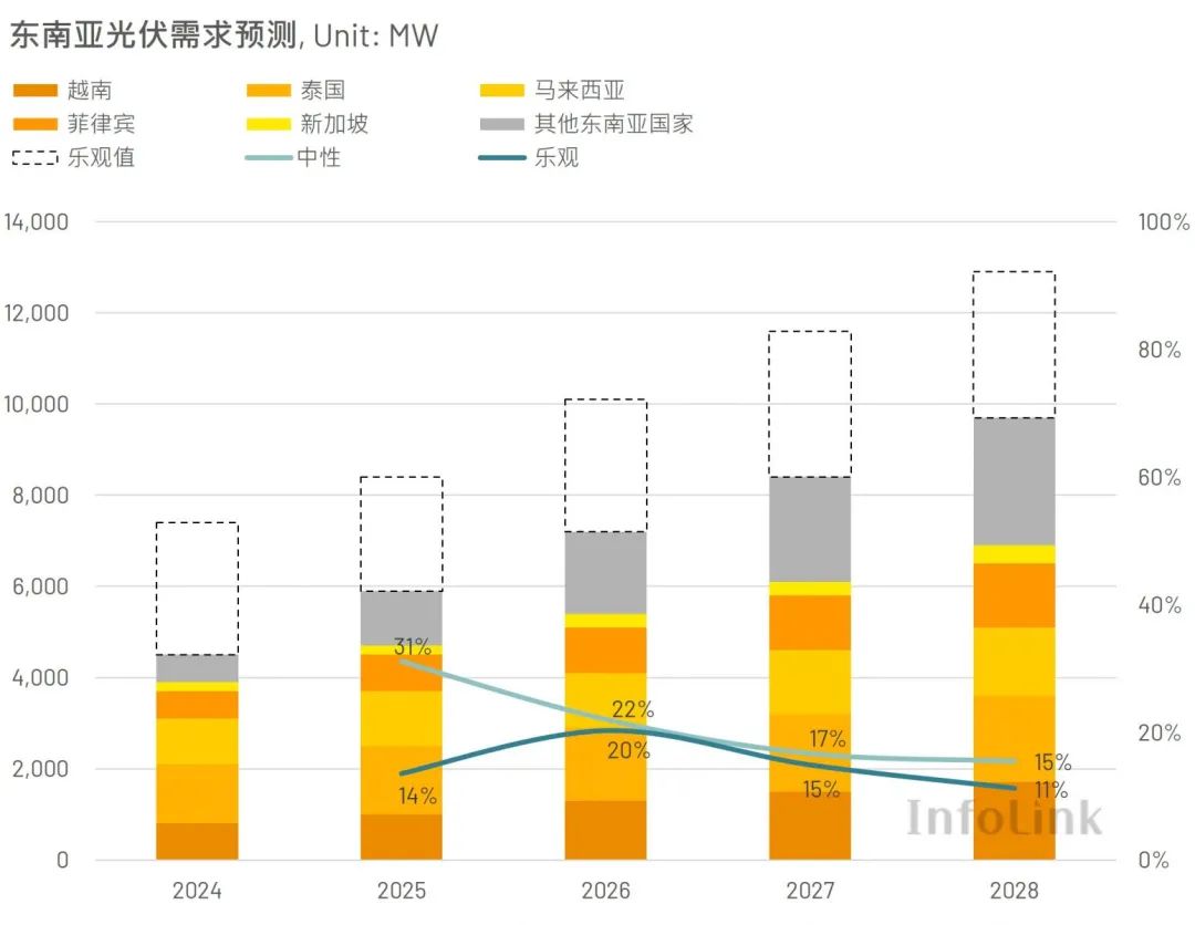 总体来看,东南亚地区有着经济增长、政策推动与国际资金的支持,迭加电网消纳问题与受到其他能源的竞争压力,InfoLink 预计 2024 年东南亚地区的光伏需求将落在 4.5-7.4 GW,长期需求则预计增长至 9.7-12.9 GW,预期东南亚光伏市场将在未来数年内维持稳健成长,成为全球能源转型中的重要一环。