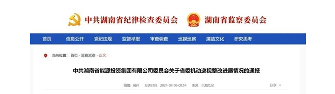 近日,湖南省纪委监委官网公布了《中共湖南省能源投资集团有限公司委员会关于省委机动巡视整改进展情况的通报》(以下简称《通报》)。
