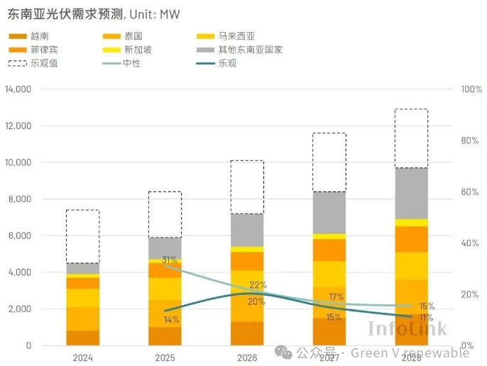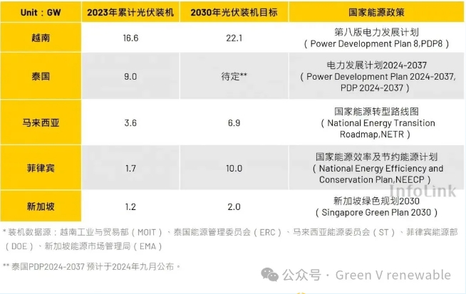 在全球致力于实现净零碳排放的大背景下,东南亚地区凭借其丰富的太阳能资源和经济的迅速崛起,正经历着产业结构转型,这一转型显著提升了绿色电力的需求。光伏发电作为推动可再生能源发展的关键力量,在该地区占据主导地位。特别地,越南、泰国、马来西亚、菲律宾以及新加坡这五个国家,通过近期实施的一系列旨在促进光伏产业发展的政策措施,展现出了强大的市场潜力,预示着东南亚即将崛起为全球光伏市场的重要一极。