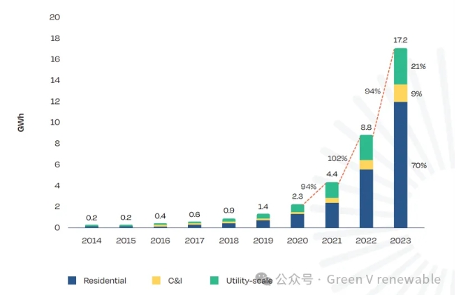 得益于政府持续不断的支持政策与有利环境,截至2024年,捷克国内的户用光伏配储率已飙升至90%以上,占据了该国整体储能市场高达97%的份额。预计全年户用储能电池的装机量将达到1.1GWh。这一趋势背后,是捷克政府推出的“新绿色投资计划”,该计划广泛覆盖了光伏发电设备、热泵、电动汽车充电桩等多种绿色能源解决方案,并强调了对户用储能系统的整合需求,从而进一步促进了户用储能细分市场的持续增长。