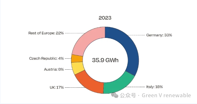 截至2023年底,欧洲地区的电池储能系统累计装机量已达到了一个显著的里程碑,即35.9GWh(如图2所示)。在市场份额的分布上,德国与意大利两大市场表现出色,共同占据了欧洲电池储能总市场超过一半(50%以上)的份额,彰显了这两个国家在推动储能技术发展和应用方面的领先地位。