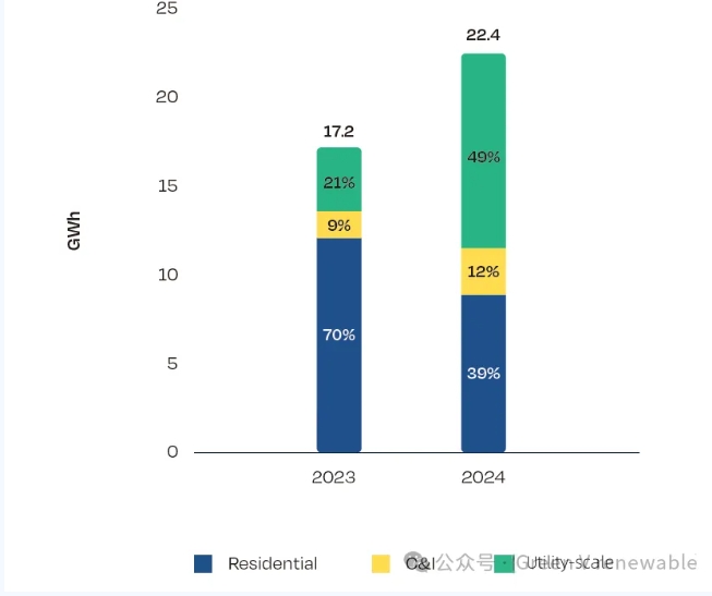2024年,德国在欧洲五大储能市场中占据20%的份额,尽管排名较2023年下滑两位至第三位,但其展现出了巨大的扩展潜力。尽管户用储能装机量预计会显著下降,但工商业和大型储能领域却呈现出积极的发展态势。