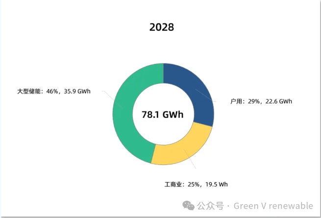 特别地,大型储能系统在这一时期将扮演核心角色,其装机占比预计将从2023年的21%大幅跃升至2028年的46%,接近36GWh的装机容量,这一数字将是2024年(约11GWh,占比49%)的三倍有余。大型储能的迅猛发展,不仅体现了技术成熟与成本效益的提升,也反映了电网稳定性和电力市场交易的迫切需求。