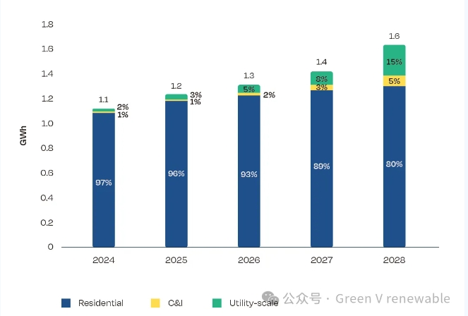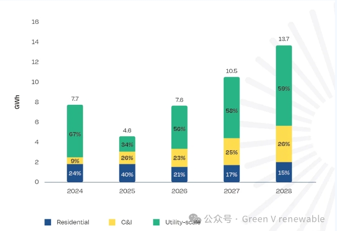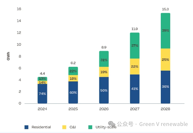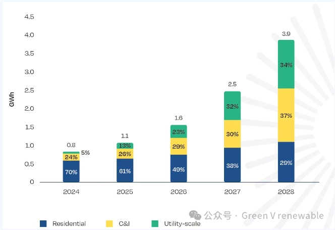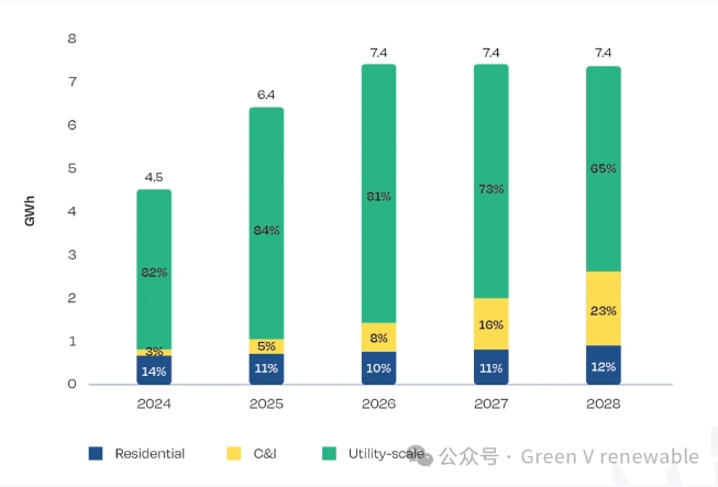 在户用储能市场方面,尽管2024年的预计装机量较2023年显著下降了40%,降至1.9 GWh,且预计未来五年内难以重返2023年的高峰水平,但户用储能仍占据市场的一定份额,预计从2024年的24%逐渐缩减至2028年的15%。