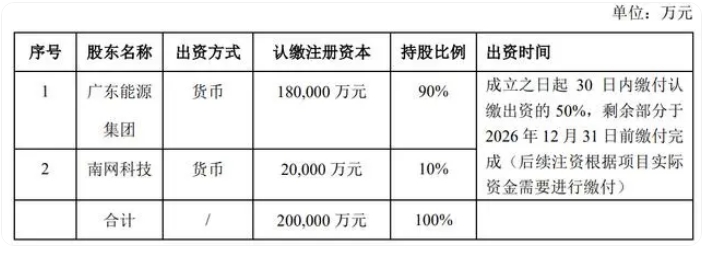 根据公告中披露股东信息显示,该公司注册资本20亿元,其中广东能源集团认缴注册资本18亿元,持股比例90%;南网科技认缴注册资本2亿元,持股10%。治理结构安排方面,其设立董事会,董事会成员5名。广东能源集团提名4人(其中1名为董事长人选)、南网科技提名1人,董事长为公司法定代表人。