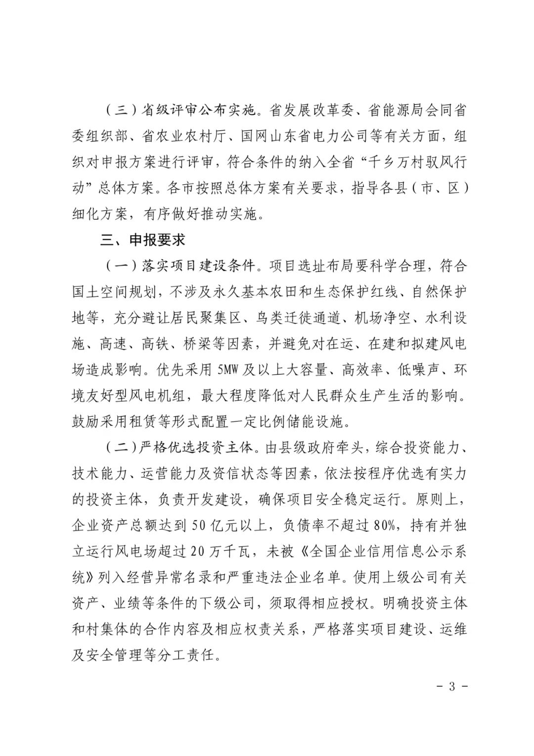 近日,山东省委组织部、山东省发展和改革委员会、山东省能源局、山东省农业农村厅发布《关于组织开展“千乡万村驭风行动”试点申报工作的通知》(以下简称《通知》)。申报要求包括,优先采用5MW及以上大容量、高效率、低噪声、环境友好型风电机组,最大程度降低对人民群众生产生活的影响。鼓励采用租赁等形式配置一定比例储能设施。严格优选投资主体。由县级政府牵头,综合投资能力、技术能力、运营能力及资信状态等因素,依法按程序优选有实力的投资主体,负责开发建设,确保项目安全稳定运行。原则上,企业资产总额达到50亿元以上,负债率不超过80%,持有并独立运行风电场超过20万千瓦,未被《全国企业信用信息公示系统》列入经营异常名录和严重违法企业名单。使用上级公司有关资产、业绩等条件的下级公司,须取得相应授权。明确投资主体和村集体的合作内容及相应权责关系,严格落实项目建设、运维及安全管理等分工责任。