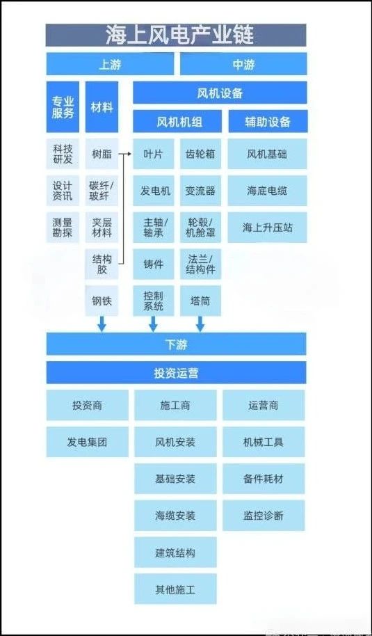 海上风电产业链可分为上游、中游、下游三个部分,其上游通常包括风电场勘察设计、风电装备关键原材料生产等。