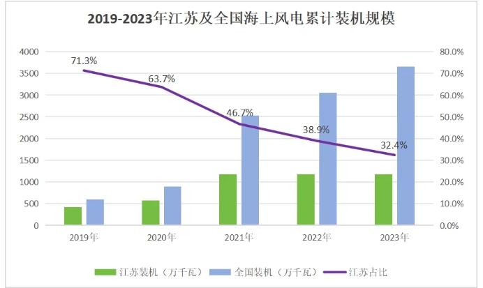 江苏海上风电产业发展目前存在一些现实的困难和问题。一方面,少数关键零部件仍需要进口或者依赖于外资企业,例如,大功率主轴轴承、变流器核心部件IGBT芯片、主控系统核心部件PLC等仍受制于人,对产品升级与产业效益造成影响。由于江苏海上风电场开发较早,同时地处低风速海域,囿于技术发展进程,多年来省内企业风电整机及零部件产品主要集中于小兆瓦风机,漂浮式风机研发也未得到足够重视。另一方面,其它沿海省份近年来普遍重视发展海上风电产业,纷纷加快海上风电开发步伐,江苏海上风电累计装机容量在全国的占比逐年下降,2019年至2023年占比分别为71.3%、63.7%、46.7%、38.9%、32.4%。尤其是,由于多种原因,2022、2023连续两年,江苏均无海上风电新增装机,省内风电装备企业总体订单减少,产值明显下降。不少相关企业部分产能存在闲置,基本依靠省外订单、国外订单维持生计,一些中小微企业或者注销或者转产。国内知名海上风电整机商及零部件企业竞相加大在其它省份的投资力度,江苏省内一些本土龙头企业,例如远景能源、天顺风能、海力风电、中天海缆、德力佳等,也靠近外省风电场设立生产基地。虽然目前江苏海上风电产业整体上仍处于全国领先地位,但其它沿海省份与江苏的差距正在不断缩小。