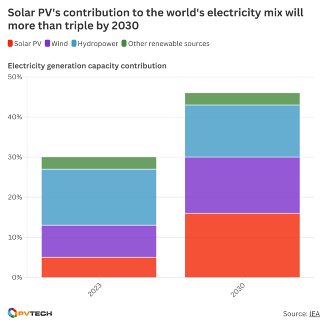 上图显示,到2030年,可再生能源将占全球能源结构的近50%,而目前这一比例约为30%。预计太阳能在未来几年将再次出现可观的增长,国际能源署预计,在2023年至2030年期间,太阳能对世界电网的贡献将从5% 跃升至16%。