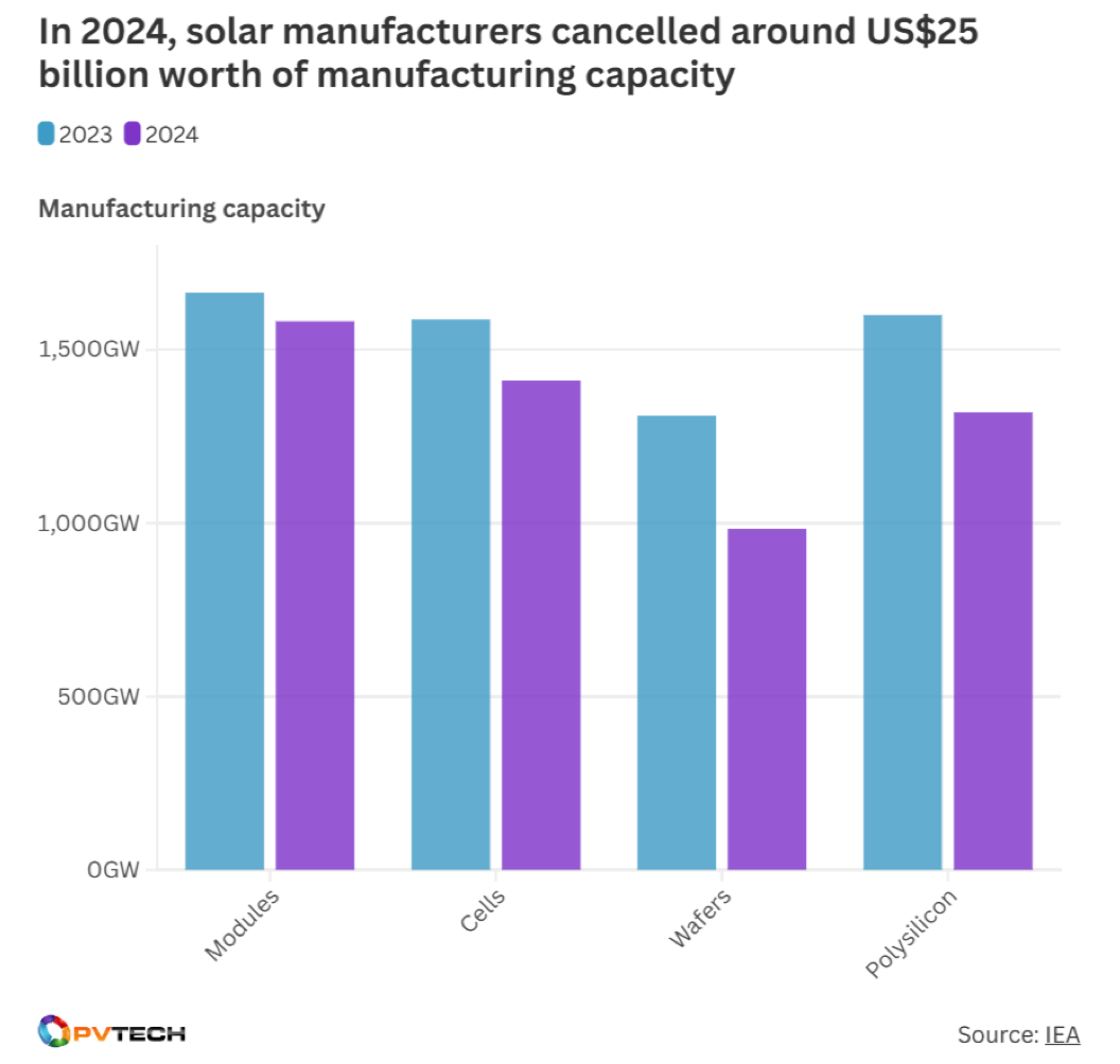 比如瑞士制造商梅耶博格,该公司今年早些时候取消了美国的一座2GW电池制造厂,这些废弃项目的总价值达到250亿美元;以及中国大部分光伏制造公司现在面临的困境。