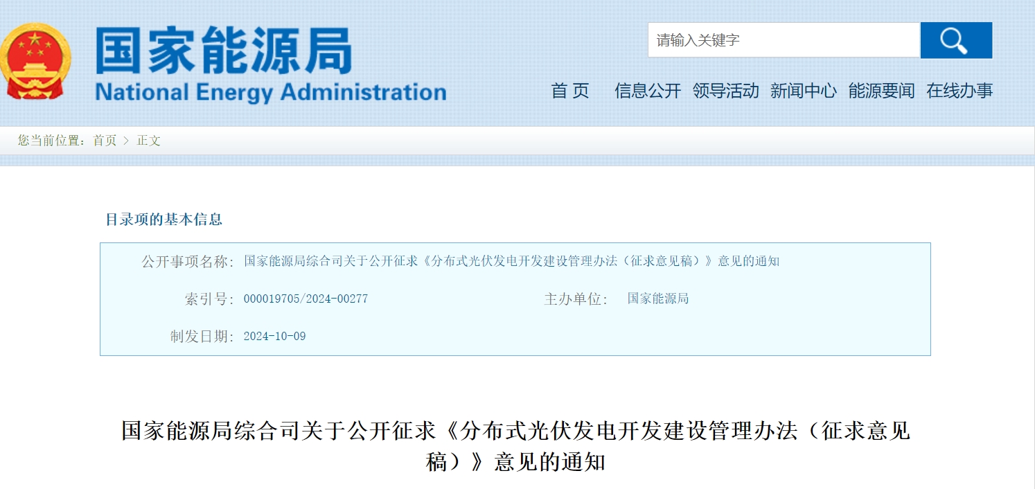 根据分布式光伏发电行业面临的新形势新任务新要求,为进一步促进分布式光伏发电健康可持续发展,我局组织起草了《分布式光伏发电开发建设管理办法(征求意见稿)》,并征求了有关方面意见。现向社会公开征求意见,时间为2024年10月9日至11月8日。欢迎有关单位和社会各界人士提出宝贵意见建议,通过电子邮件或传真等形式反馈至我局新能源司。