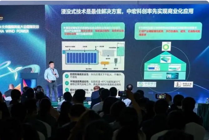 10月16日,在2024北京国际风能大会中,中宏科创携手bp嘉实多联合发布分布式浸没储能产品,该产品也是国内首个成功通过新国标认证的浸没式锂电产品。