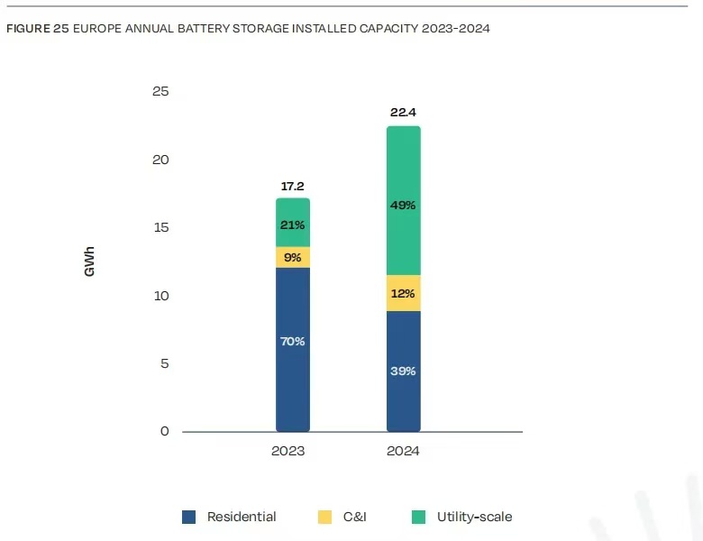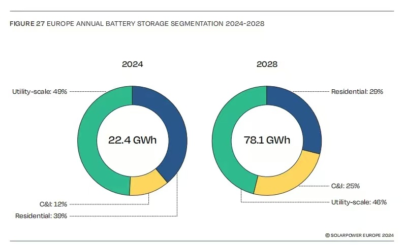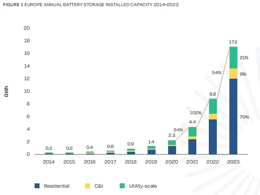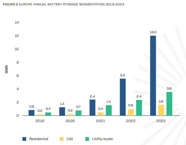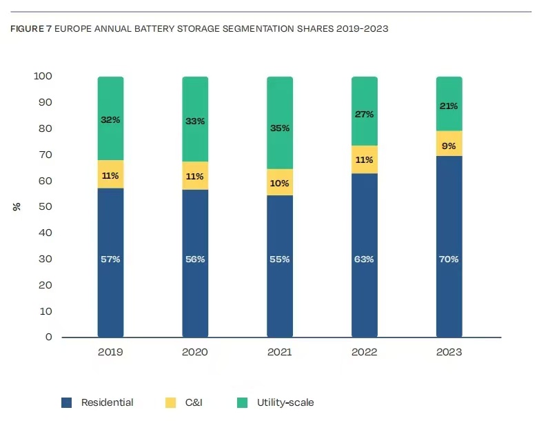 2023-2024年欧洲储能市场新增装机及各细分领域占比