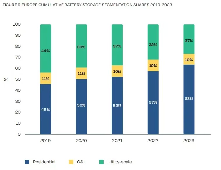 2019-2023年欧洲储能市场累计装机各细分领域占比