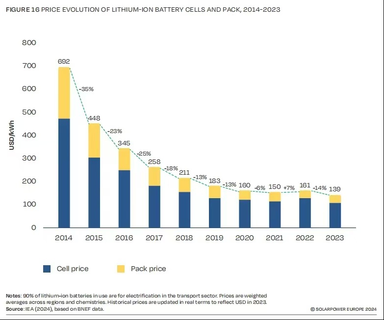 2014-2023年磷酸铁锂电芯和Pack电池价格下降情况