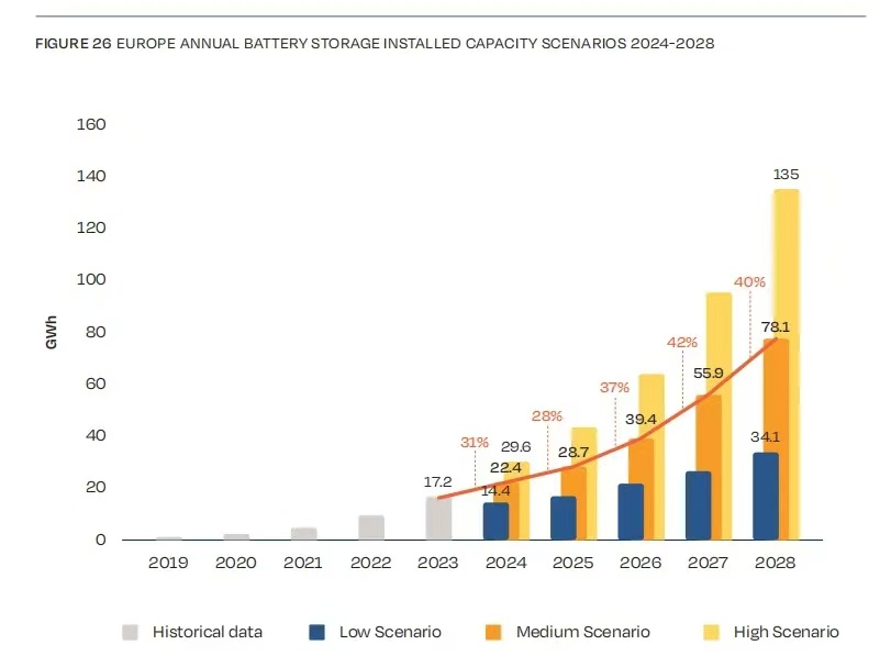 2024-2028年欧洲储能市场新增装机预测(低中高三种情景预测)