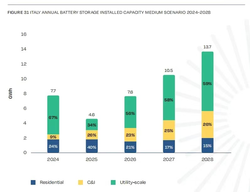 在工商业储能领域,意大利是最具吸引力的市场之一。中期前景预测下,其工商业储能市场的装机会从2024年的674MWh增长到2028年的3.6GWh。