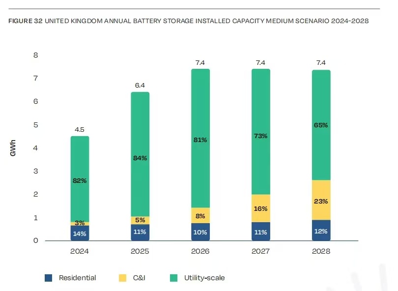 中期前景预测下,到2028年,英国新增储能装机将达到7.4GWh,占到欧洲新增装机的9%。