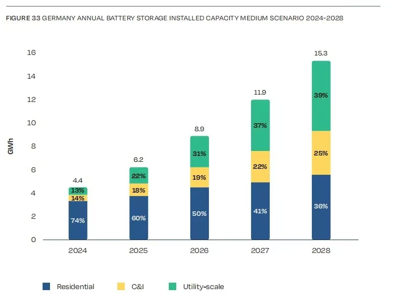 2024年,德国失去了两个名次,但仍然是具有最大潜力的国家之一:户储大幅下降,但工商业储能和大储市场增长。