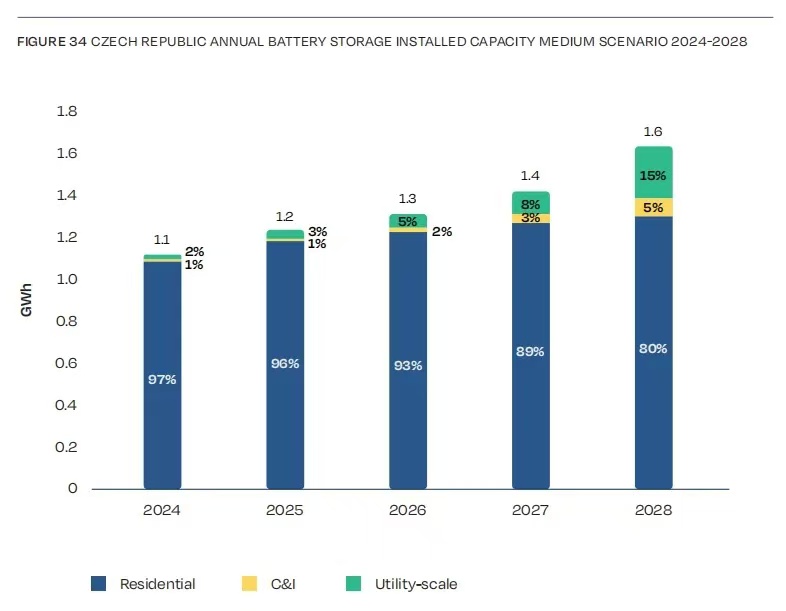 2024年,捷克市场排名第四。直到2028年,捷克都会保持相对平稳的增长,主要由户储驱动。