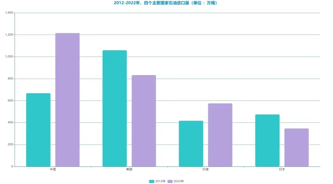 在2012-2022年期间,世界石油进口舞台上,有四个国家成为主角。
